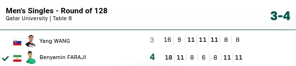 بنیامین فرجی، بازیکن تیم ملی پینگ پنگ ایران، در یک دیدار مهیج مقابل وانگ یانگ از اسلوواکی به رقابت پرداخت. نتیجه نهایی این مسابقه پیروزی بر بود.