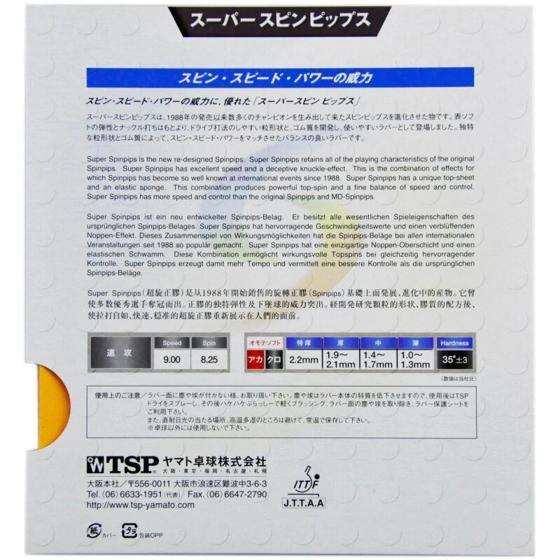 TSP Super Spinpips رویه ای انعطاف پذیر است و پیشرفت های بزرگی در شکل دانه ها ایجاد شده است. این لاستیک نرم با چرخش عالی پایداری بسیار خوبی دارد. Super Spinpips Spinpips رویه ای جدید است. Super Spinpips دارای سرعت عالی و جلوه فریبنده است. این ترکیبی از افکتهایی است که Spinpips از سال 1988 به خاطر آن در رویدادهای بینالمللی شناخته شده است. اسفنج Super spinpips 21 دارای یک صفحه رویه منحصر به فرد و یک اسفنج الاستیک است. این ترکیب شات های تاپ اسپین قوی تری نسبت به دانه های چرخشی اصلی ایجاد می کند. تمام ویژگی های بازی اصلی لاستیک های Spinpips اصلی را حفظ کرده است. این سرعت عالی و اثر شگفت انگیز رویه دانه کوتاه را فراهم می کند. ترکیب این ویژگی ها باعث شده تا Spinpips در رویدادهای بین المللی بسیار محبوب شود. Super Spinpips دارای یک صفحه رویه منحصر به فرد و یک اسفنج الاستیک است. این ترکیب یک چرخش بالا و تعادل خوب بین سرعت و کنترل ایجاد می کند. Super Spinpips به طور موثر سرعت و کنترل بیشتری نسبت به Spinpips اصلی دارد.