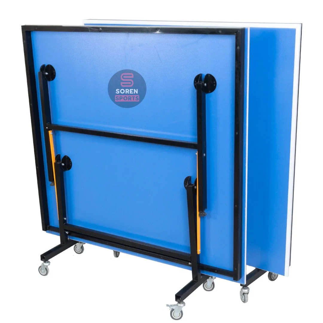 میز پینگ پنگ 8 چرخ ملامین ضد خش همچنین دارای رنگ آبی و سفارشی است که آن را به یک گزینه جذاب برای بازیکنان تبدیل میکند. این میز هم در فضای بسته و هم در فضای باز قابل استفاده است و به راحتی میتوان آن را جمع کرد و حمل کرد.